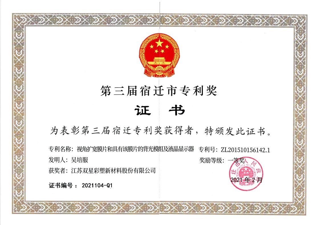 2021年5月7日,全市加快工業(yè)經(jīng)濟(jì)高質(zhì)量發(fā)展暨招商引資大會(huì)上,表彰了第三屆宿遷市專利獎(jiǎng)獲獎(jiǎng)單位,公司申報(bào)的“視角擴(kuò)寬膜片和具有該膜片的背光模組及液晶顯示器”專利項(xiàng)目榮獲一等獎(jiǎng)。