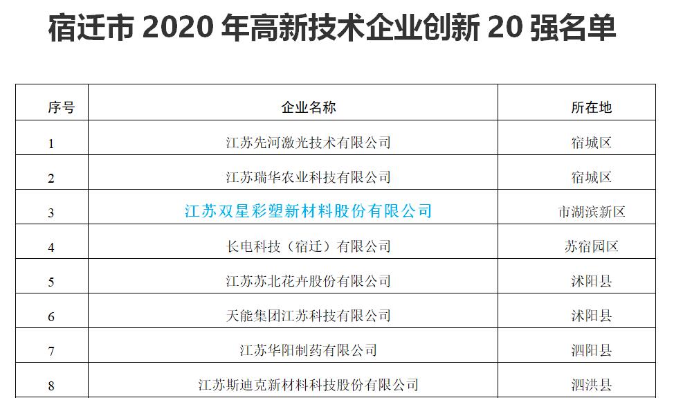 近日經專家審核以及一系列嚴格的評選流程,雙星新材憑借領先的技術實力、突出的產品優勢和企業成長潛力,成功入選“2020宿遷高新技術企業20強”企業,這是雙星新材2020年度榮獲的又一含金量十足的企業榮譽。