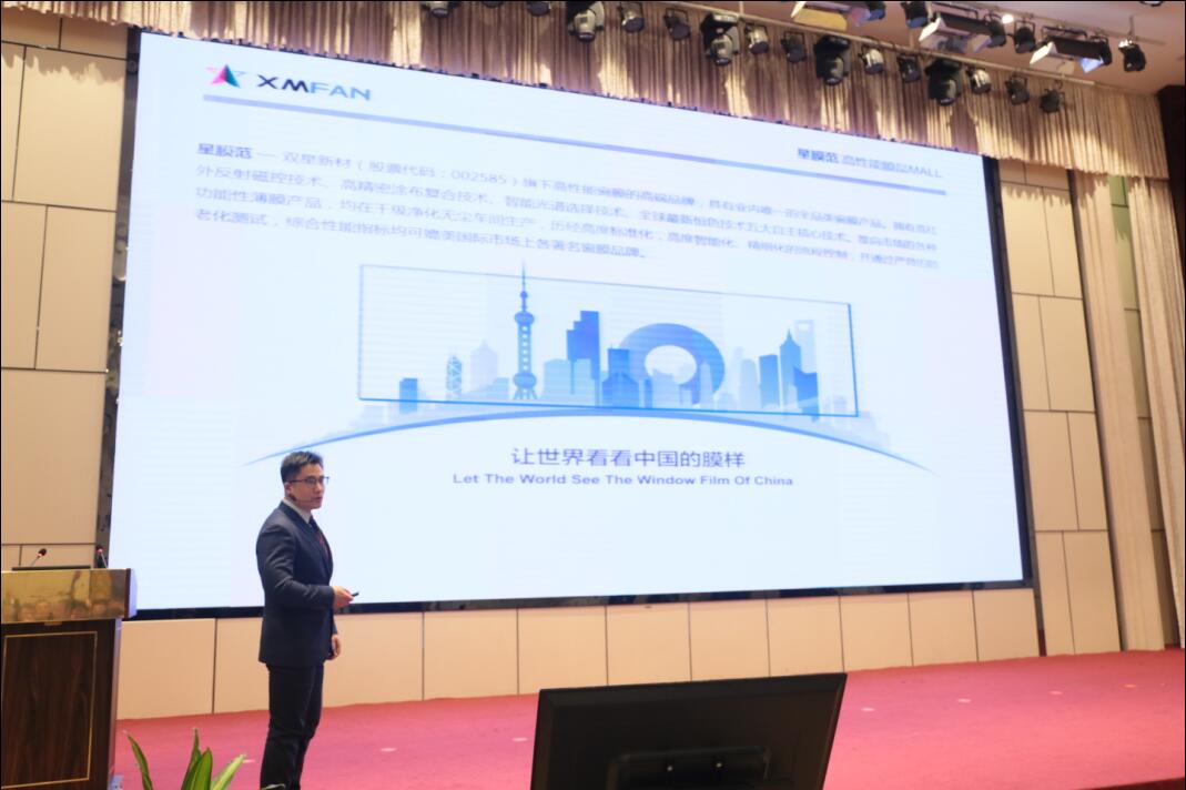圖為公司副總經(jīng)理工程師陸敬權(quán)為來(lái)賓介紹雙星節(jié)能窗膜新品