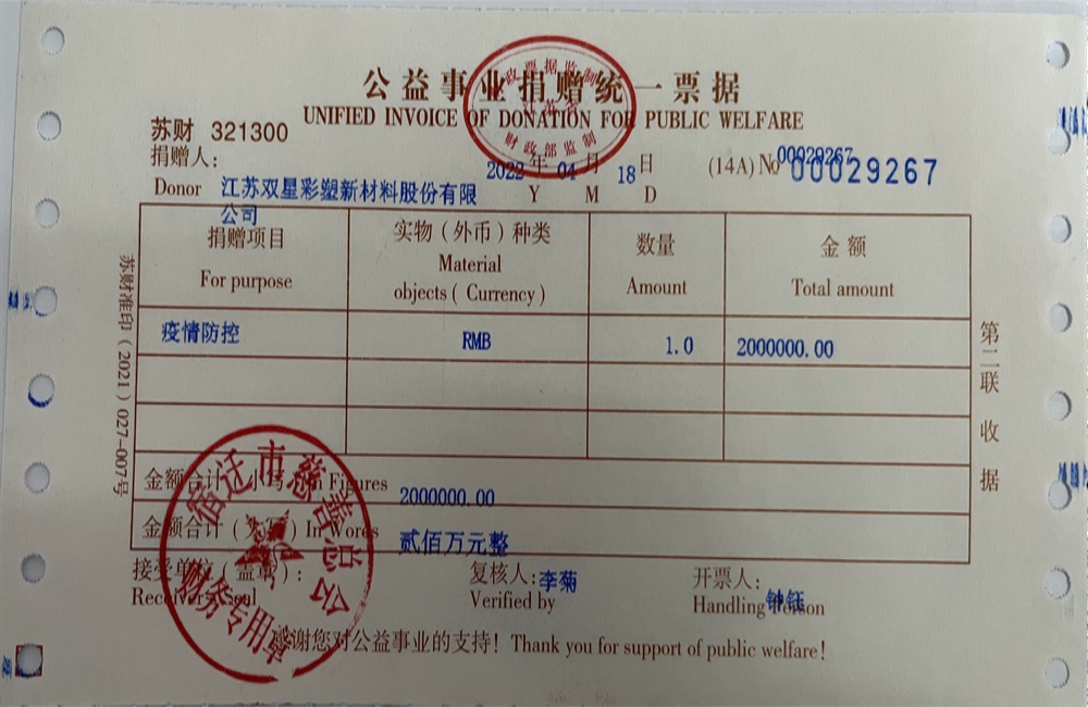 近期,宿遷中心城區轉入常態化疫情防控階段,在“管住”的基礎上實現“放開”,迅速恢復經濟運行正常秩序,宿遷經濟技術開發區等四個功能區是復工復產的主戰場。雙星新材高度重視,積極響應政府號召, 4月18日雙星新材向宿遷市慈善總會捐款200萬元,專項用于“四個功能區”常態化疫情防控和中心城區重點醫院購買防疫物資。鞏固抗疫成果,助力復工復產,全力支援抗擊疫情工作,為打贏這場戰爭貢獻一份力量。相信在雙星新材和所有愛心人士的幫助下,全民一心、眾志成城,疫情定能夠早日成為過去。