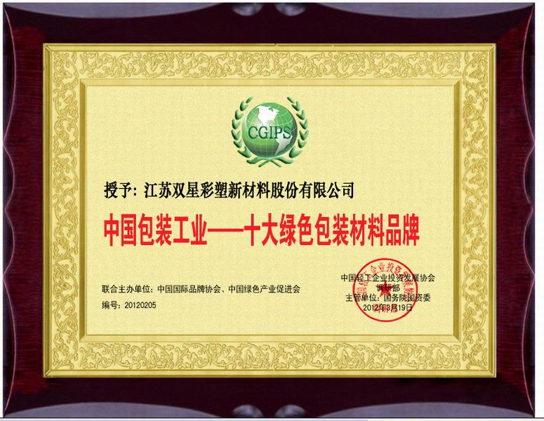 近日,公司被“中國輕工業(yè)投資發(fā)展協(xié)會”授予“中國包裝工業(yè)——十大綠色包裝材料品牌”。