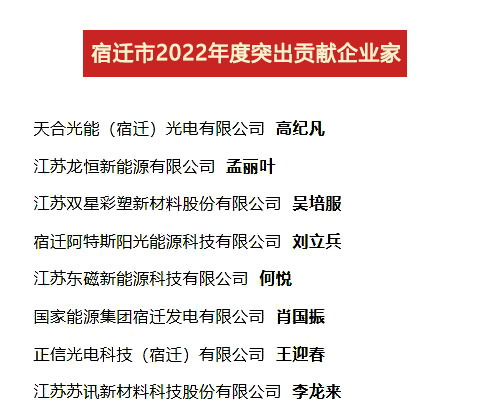 2023年4月7日,全市開發(fā)區(qū)高質(zhì)量發(fā)展暨工業(yè)經(jīng)濟年度表彰大會召開,公布了2022年度“宿遷市突出貢獻企業(yè)家”名單,公司董事長吳培服喜獲“宿遷市突出貢獻企業(yè)家”殊榮。