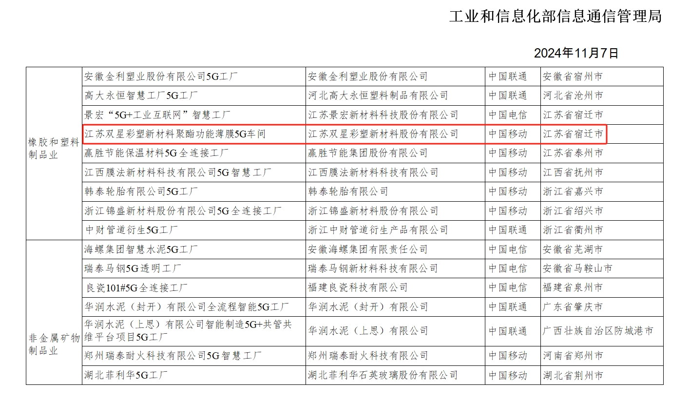 近日,工業和信息化部發布了關于《2024年5G工廠名錄》的公示,江蘇雙星彩塑新材料股份有限公司成功入選。