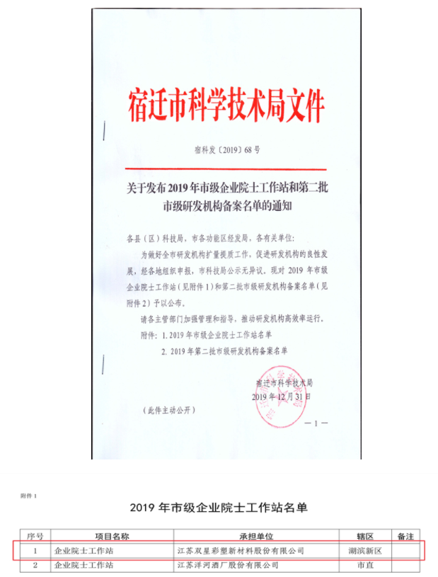 近日,從宿遷市科技局公布的2019年市級企業院士工作站名單中,江蘇雙星彩塑新材料股份有限公司組建的“企業院士工作站”喜獲批復建設。